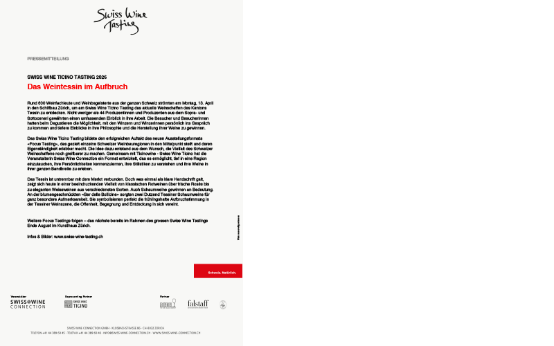 Als Pressevertreter, Aussteller oder auch Besucher können Sie diverse Dokumente zum Swiss Wine Tasting herunterladen, um damit ihre Leser, Kunden oder Freunde über den wichtigsten Event der Schweizer Weinszene zu informieren.